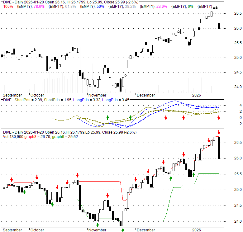 Price has closed below its short-term moving average. Short-term moving average is currently above mid-term; and below long-term moving average. From the relationship between price and moving averages: This stock is NEUTRAL in short-term; and NEUTRAL in mid-long term.[ DIVE ] has closed above bottom band by 40.8%. Bollinger Bands are 0% narrower than normal.