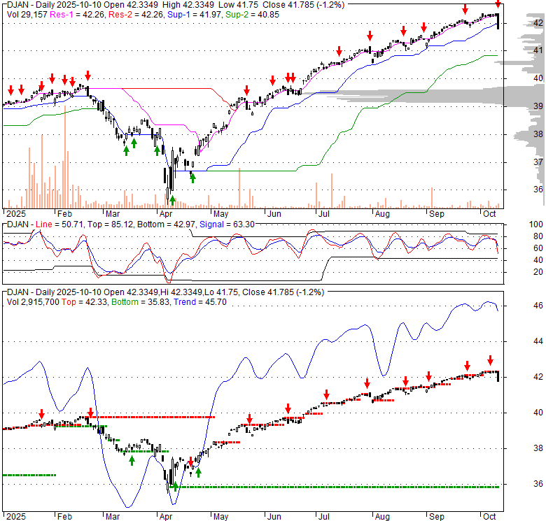 Price has closed below its short-term moving average. Short-term moving average is currently above mid-term; and above long-term moving average. From the relationship between price and moving averages: This stock is NEUTRAL in short-term; and BULLISH in mid-long term.[ DJAN ] has closed below the lower bollinger band by 7.9%. If price is in a downtrend band; this downward trend might continue. However a short term pullback inside the band is likely. Bollinger Bands are 29% narrower than normal. The current width of the bands does not suggest anything about the future direction or movement of prices.