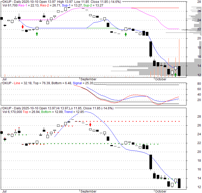 Price has closed below its short-term moving average. Short-term moving average is currently below mid-term; and below long-term moving average. From the relationship between price and moving averages: This stock is BEARISH in short-term; and NEUTRAL in mid-long term.[ DKUP ] has closed above bottom band by 18.7%. Bollinger Bands are 0% narrower than normal.