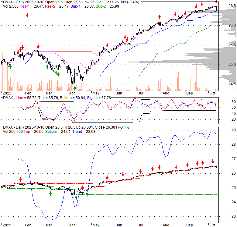 Price has closed below its short-term moving average. Short-term moving average is currently above mid-term; and above long-term moving average. From the relationship between price and moving averages: This stock is NEUTRAL in short-term; and BULLISH in mid-long term.[ DMAX ] has closed above bottom band by 26.1%. Bollinger Bands are 30.4% narrower than normal. The current width of the bands does not suggest anything about the future direction or movement of prices.