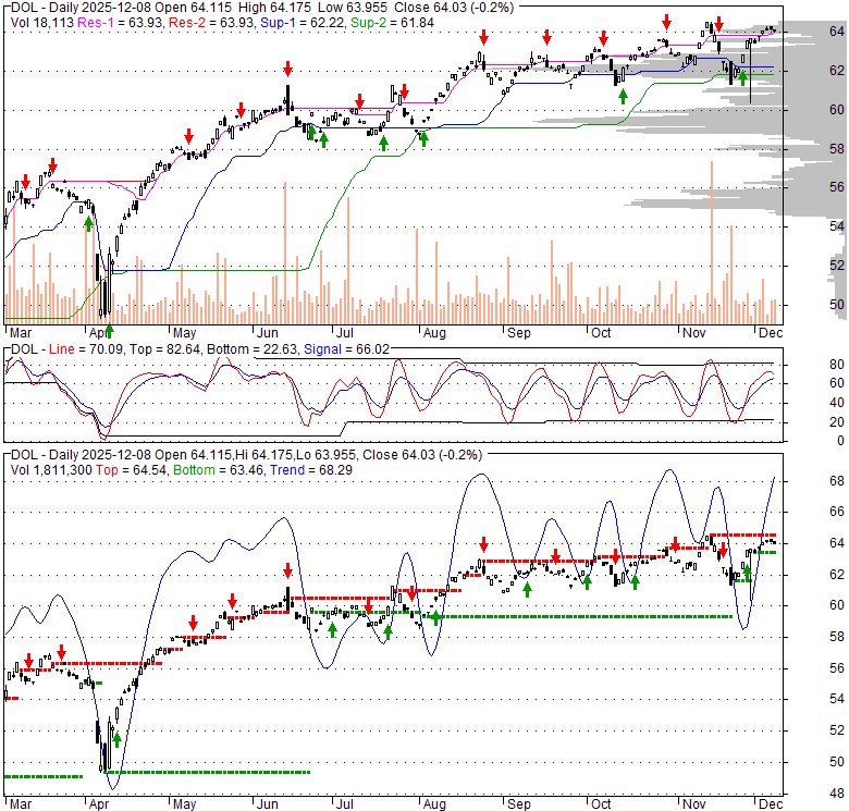 Price has closed above its short-term moving average. Short-term moving average is currently above mid-term; and above long-term moving average. From the relationship between price and moving averages: This stock is BULLISH in short-term; and BULLISH in mid-long term.[ DOL ] has closed below upper band by 19.8%. Bollinger Bands are 40.5% wider than normal. The large width of the bands suggest high volatility as compared to its normal range. The bands have been in this wide range for 0 days. This is a sign that the current trend might continue.