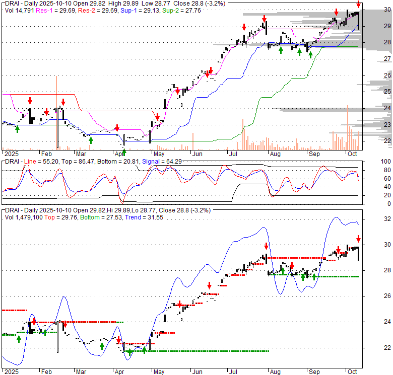 Price has closed below its short-term moving average. Short-term moving average is currently above mid-term; and above long-term moving average. From the relationship between price and moving averages: This stock is NEUTRAL in short-term; and BULLISH in mid-long term.[ DRAI ] has closed below the lower bollinger band by 2.0%. Although price has broken the lower band and a downside breakout is possible; the most likely direction for [ DRAI ] is to continue within current trading range. Bollinger Bands are 34.8% narrower than normal. The current width of the bands does not suggest anything about the future direction or movement of prices.