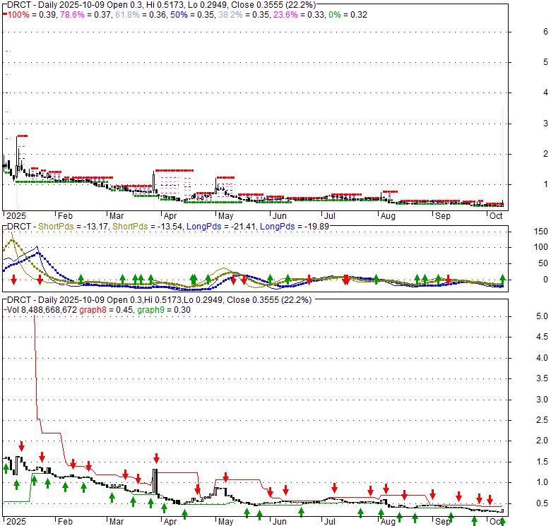 Price has closed above its short-term moving average. Short-term moving average is currently below mid-term; and below long-term moving average. From the relationship between price and moving averages: This stock is NEUTRAL in short-term; and BEARISH in mid-long term.[ DRCT ] has closed below upper band by 37.4%. Bollinger Bands are 39.3% narrower than normal. The current width of the bands does not suggest anything about the future direction or movement of prices.