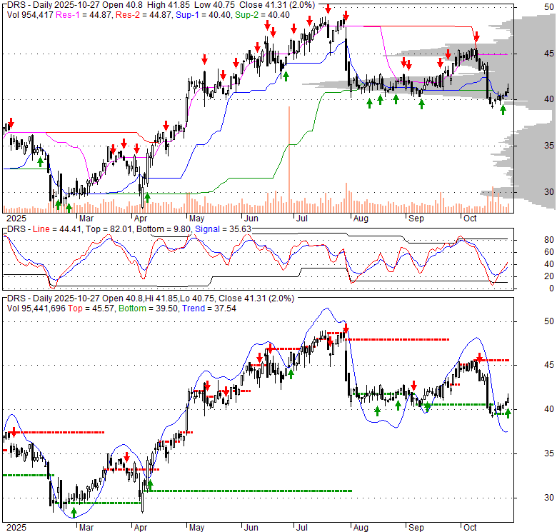 Price has closed above its short-term moving average. Short-term moving average is currently below mid-term; and below long-term moving average. From the relationship between price and moving averages: This stock is NEUTRAL in short-term; and BEARISH in mid-long term.[ DRS ] has closed above bottom band by 41.5%. Bollinger Bands are 56.2% wider than normal. The large width of the bands suggest high volatility as compared to its normal range. The bands have been in this wide range for 8 days. This is a sign that the current trend might continue.