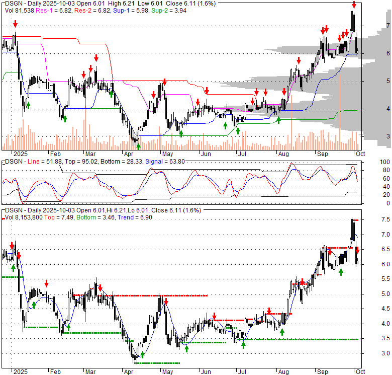 Price has closed below its short-term moving average. Short-term moving average is currently above mid-term; and above long-term moving average. From the relationship between price and moving averages: This stock is NEUTRAL in short-term; and BULLISH in mid-long term.[ DSGN ] has closed above bottom band by 38.4%. Bollinger Bands are 58.2% wider than normal. The large width of the bands suggest high volatility as compared to its normal range. The bands have been in this wide range for 3 days. This is a sign that the current trend might continue.