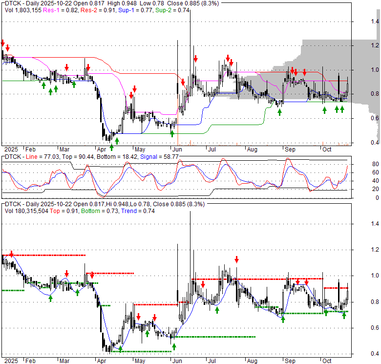 Price has closed above its short-term moving average. Short-term moving average is currently below mid-term; and below long-term moving average. From the relationship between price and moving averages: This stock is NEUTRAL in short-term; and BEARISH in mid-long term.[ DTCK ] has closed Bollinger Bands are 43.8% narrower than normal. The narrow width of the bands suggests low volatility as compared to its normal range. The bands have been in this narrow range for 10 bars. This is a sign that the market may be about to initiate a new trend.