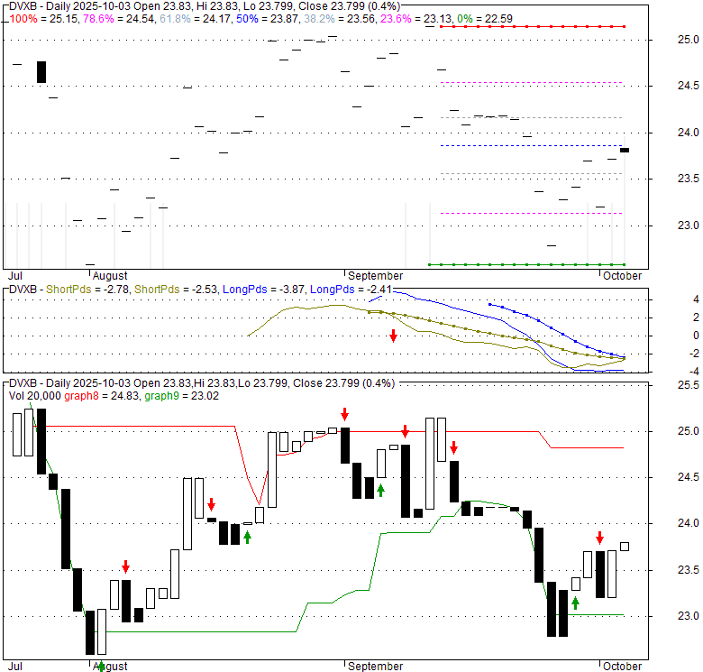 Price has closed above its short-term moving average. Short-term moving average is currently below mid-term; and below long-term moving average. From the relationship between price and moving averages: This stock is NEUTRAL in short-term; and NEUTRAL in mid-long term.[ DVXB ] has closed below upper band by 47.1%. Bollinger Bands are 0% narrower than normal.