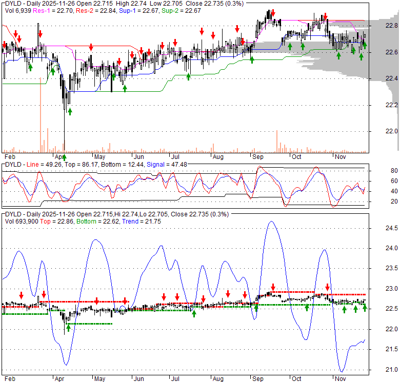 Price has closed above its short-term moving average. Short-term moving average is currently below mid-term; and below long-term moving average. From the relationship between price and moving averages: This stock is NEUTRAL in short-term; and NEUTRAL in mid-long term.[ DYLD ] has closed below upper band by 3.9%. Bollinger Bands are 44.9% narrower than normal. The narrow width of the bands suggests low volatility as compared to its normal range. The bands have been in this narrow range for 0 bars. This is a sign that the market may be about to initiate a new trend.