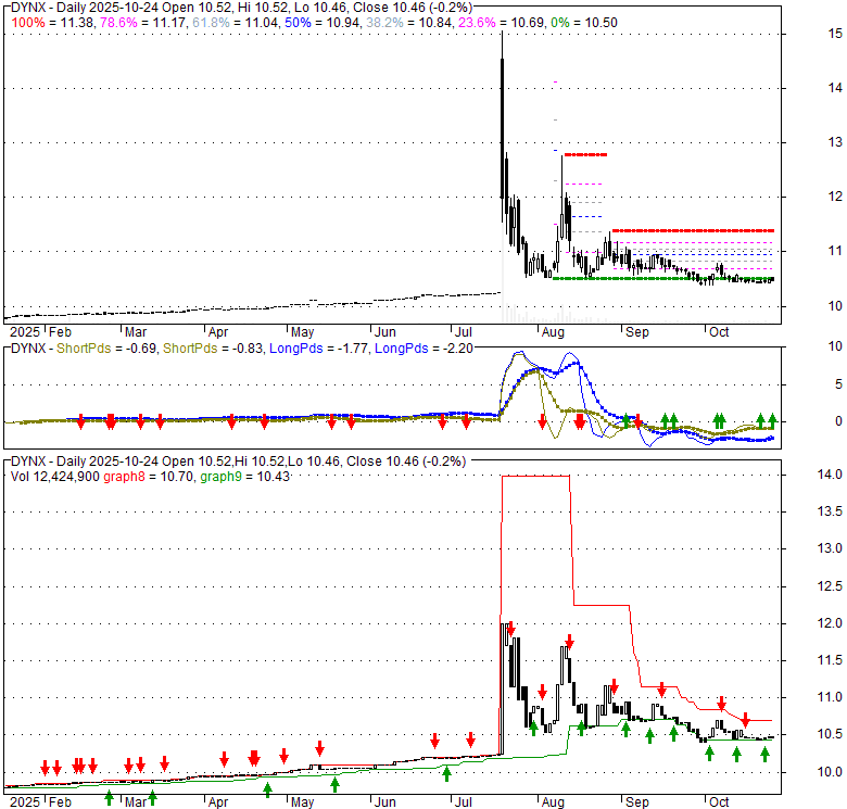 Price has closed above its short-term moving average. Short-term moving average is currently below mid-term; and below long-term moving average. From the relationship between price and moving averages: This stock is NEUTRAL in short-term; and NEUTRAL in mid-long term.[ DYNX ] has closed above bottom band by 35.3%. Bollinger Bands are 63.1% narrower than normal. The narrow width of the bands suggests low volatility as compared to its normal range. The bands have been in this narrow range for 13 bars. This is a sign that the market may be about to initiate a new trend.