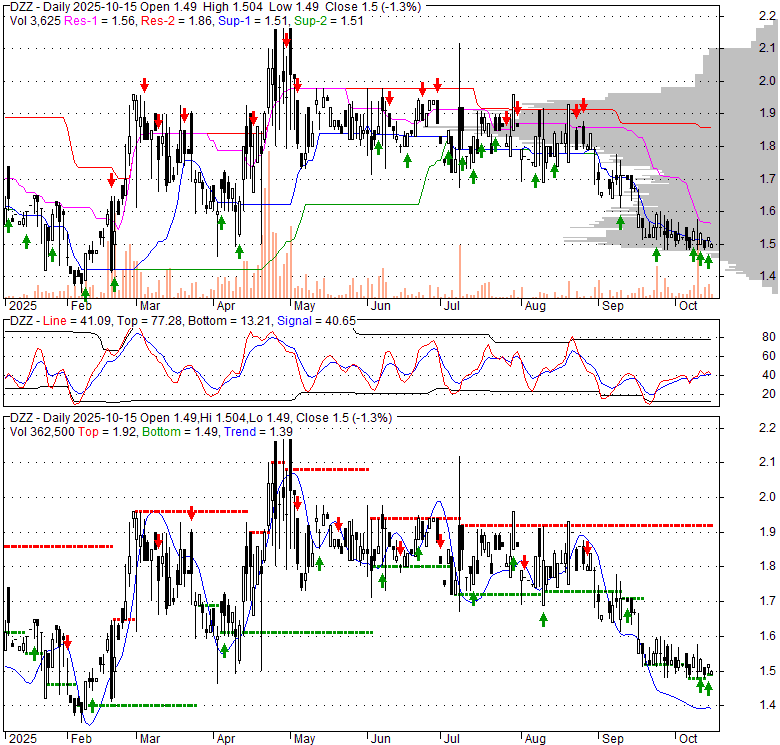 Price has closed below its short-term moving average. Short-term moving average is currently below mid-term; and below long-term moving average. From the relationship between price and moving averages: This stock is BEARISH in short-term; and BEARISH in mid-long term.[ DZZ ] has closed above bottom band by 23.8%. Bollinger Bands are 66.1% narrower than normal. The narrow width of the bands suggests low volatility as compared to its normal range. The bands have been in this narrow range for 6 bars. This is a sign that the market may be about to initiate a new trend.