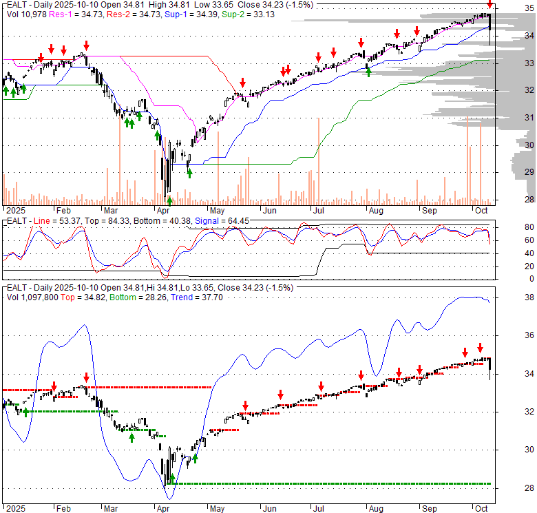 Price has closed below its short-term moving average. Short-term moving average is currently above mid-term; and above long-term moving average. From the relationship between price and moving averages: This stock is NEUTRAL in short-term; and BULLISH in mid-long term.[ EALT ] has closed below the lower bollinger band by 9.5%. If price is in a downtrend band; this downward trend might continue. However a short term pullback inside the band is likely. Bollinger Bands are 20.4% narrower than normal. The current width of the bands does not suggest anything about the future direction or movement of prices.