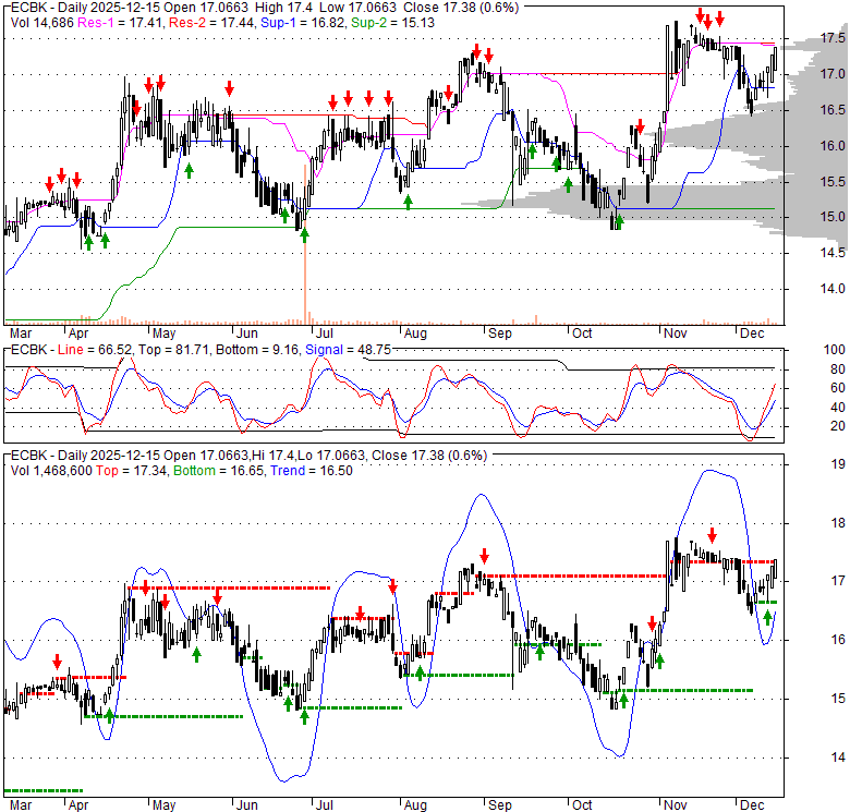 Price has closed above its short-term moving average. Short-term moving average is currently above mid-term; and above long-term moving average. From the relationship between price and moving averages: This stock is BULLISH in short-term; and BULLISH in mid-long term.[ ECBK ] has closed below upper band by 23.2%. Bollinger Bands are 14.6% narrower than normal. The current width of the bands does not suggest anything about the future direction or movement of prices.