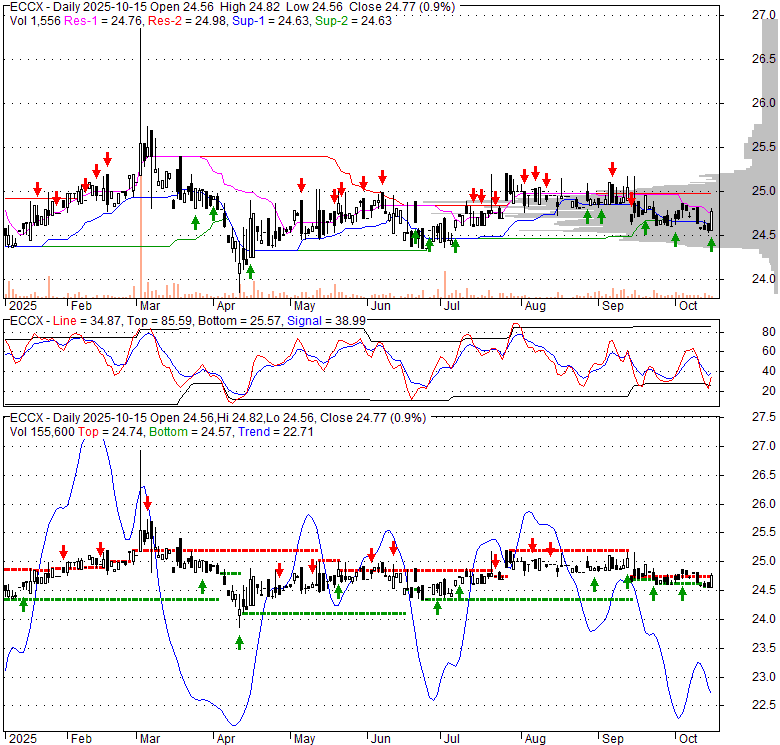 Price has closed below its short-term moving average. Short-term moving average is currently below mid-term; and below long-term moving average. From the relationship between price and moving averages: This stock is BEARISH in short-term; and NEUTRAL in mid-long term.[ ECCX ] has closed above bottom band by 19.0%. Bollinger Bands are 19.7% narrower than normal. The current width of the bands does not suggest anything about the future direction or movement of prices.