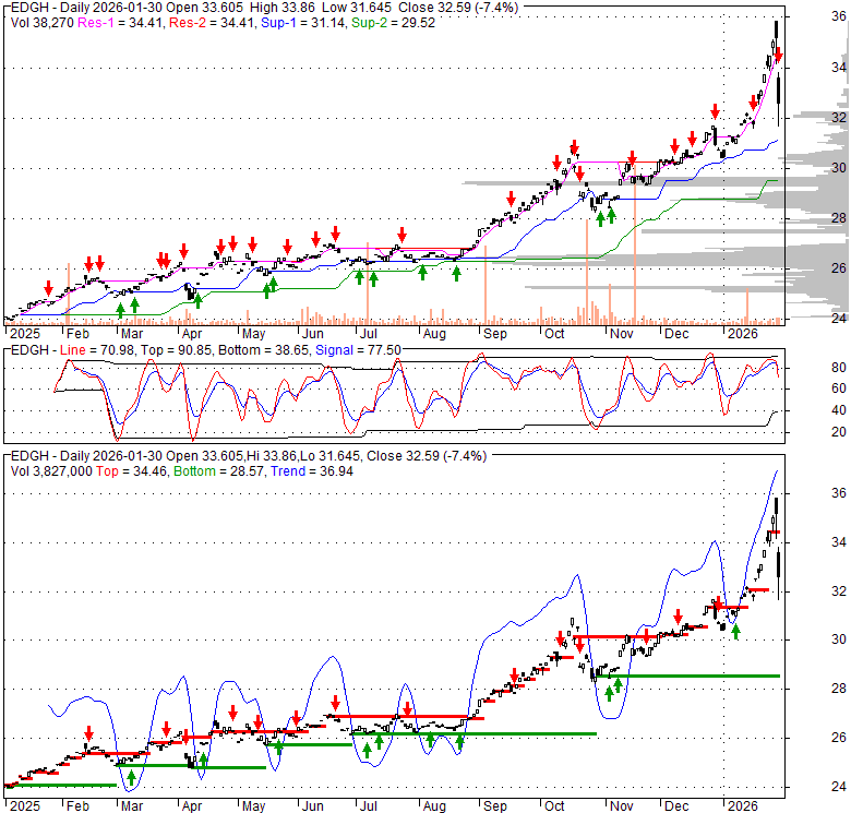 Price has closed below its short-term moving average. Short-term moving average is currently above mid-term; and above long-term moving average. From the relationship between price and moving averages: This stock is NEUTRAL in short-term; and BULLISH in mid-long term.[ EDGH ] has closed above bottom band by 42.6%. Bollinger Bands are 154.6% wider than normal. The large width of the bands suggest high volatility as compared to its normal range. The bands have been in this wide range for 8 days. This is a sign that the current trend might continue.