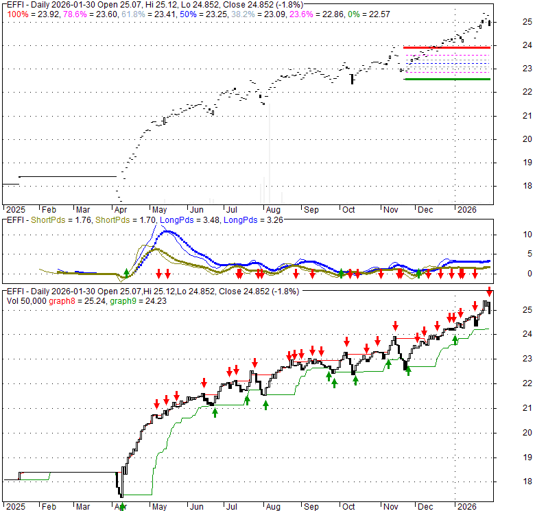 Price has closed below its short-term moving average. Short-term moving average is currently above mid-term; and above long-term moving average. From the relationship between price and moving averages: This stock is NEUTRAL in short-term; and BULLISH in mid-long term.[ EFFI ] has closed below upper band by 47.4%. Bollinger Bands are 26.8% wider than normal. The current width of the bands does not suggest anything about the future direction or movement of prices.