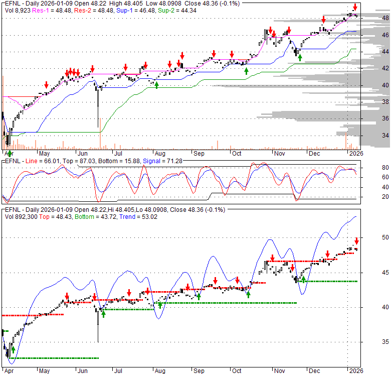Price has closed below its short-term moving average. Short-term moving average is currently above mid-term; and above long-term moving average. From the relationship between price and moving averages: This stock is NEUTRAL in short-term; and BULLISH in mid-long term.[ EFNL ] has closed below upper band by 31.6%. Bollinger Bands are 9.6% wider than normal. The current width of the bands does not suggest anything about the future direction or movement of prices.