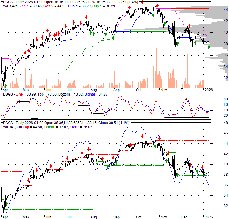 Price has closed above its short-term moving average. Short-term moving average is currently below mid-term; and below long-term moving average. From the relationship between price and moving averages: This stock is NEUTRAL in short-term; and BEARISH in mid-long term.[ EGGS ] has closed above bottom band by 37.6%. Bollinger Bands are 19.3% narrower than normal. The current width of the bands does not suggest anything about the future direction or movement of prices.
