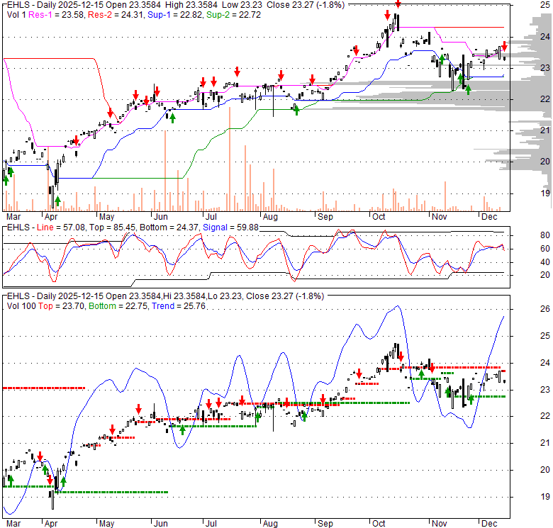 Price has closed below its short-term moving average. Short-term moving average is currently above mid-term; and above long-term moving average. From the relationship between price and moving averages: This stock is NEUTRAL in short-term; and BULLISH in mid-long term.[ EHLS ] has closed above bottom band by 28.8%. Bollinger Bands are 38.6% narrower than normal. The current width of the bands does not suggest anything about the future direction or movement of prices.