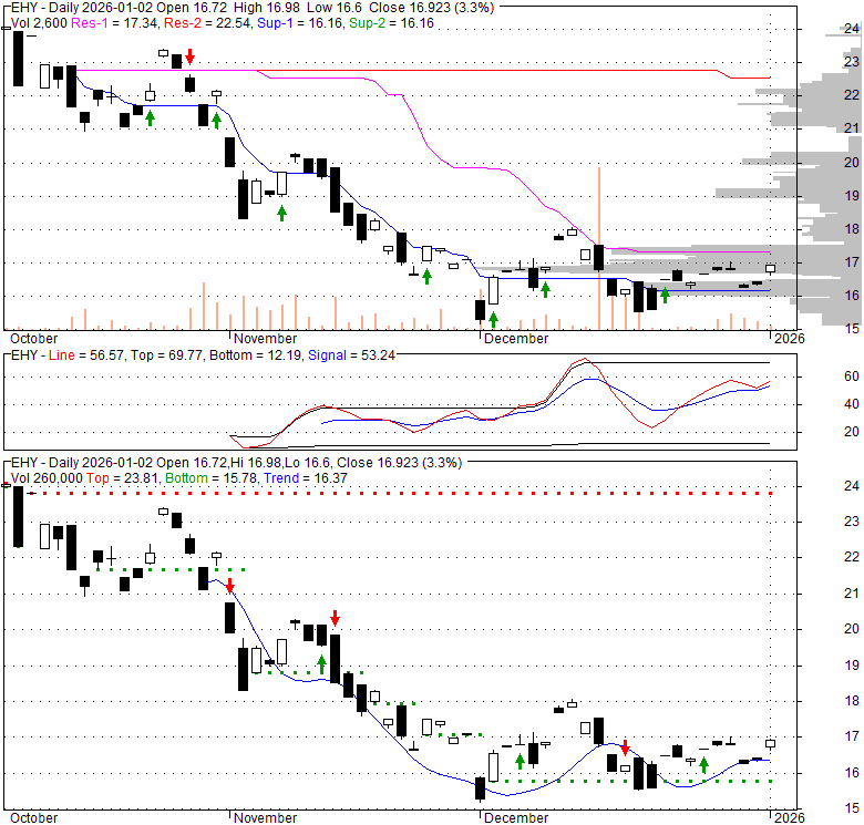 Price has closed above its short-term moving average. Short-term moving average is currently below mid-term; and below long-term moving average. From the relationship between price and moving averages: This stock is NEUTRAL in short-term; and NEUTRAL in mid-long term.[ EHY ] has closed below upper band by 25.4%. Bollinger Bands are 0% narrower than normal.