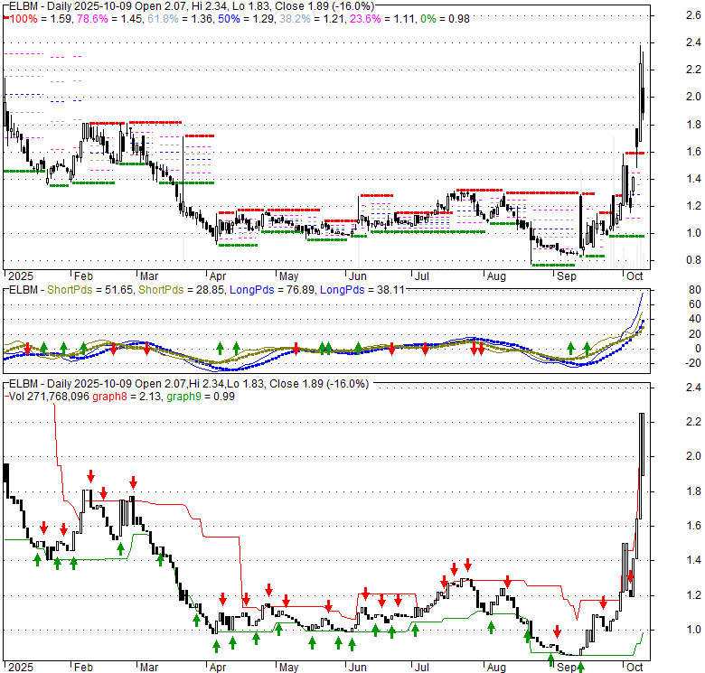 Price has closed above its short-term moving average. Short-term moving average is currently above mid-term; and above long-term moving average. From the relationship between price and moving averages: This stock is BULLISH in short-term; and NEUTRAL in mid-long term.[ ELBM ] has closed below upper band by 7.7%. Bollinger Bands are 458.8% wider than normal. The large width of the bands suggest high volatility as compared to its normal range. The bands have been in this wide range for 14 days. This is a sign that the current trend might continue.