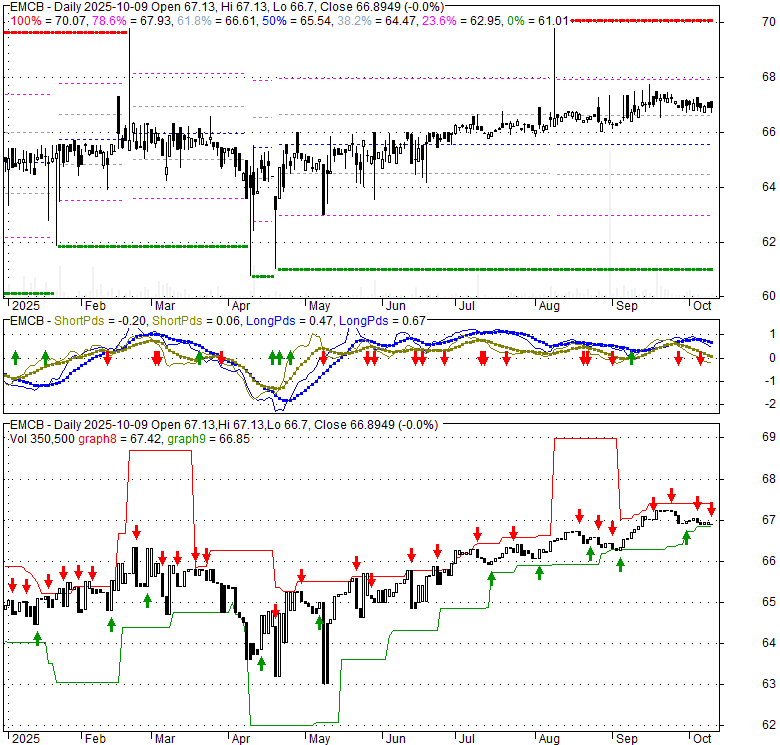 Price has closed above its short-term moving average. Short-term moving average is currently above mid-term; and above long-term moving average. From the relationship between price and moving averages: This stock is BULLISH in short-term; and BULLISH in mid-long term.[ EMCB ] has closed above bottom band by 43.3%. Bollinger Bands are 47.6% narrower than normal. The narrow width of the bands suggests low volatility as compared to its normal range. The bands have been in this narrow range for 7 bars. This is a sign that the market may be about to initiate a new trend.