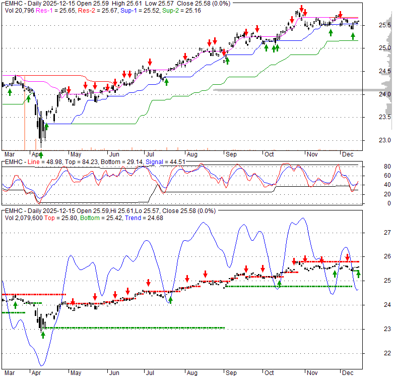 Price has closed above its short-term moving average. Short-term moving average is currently above mid-term; and above long-term moving average. From the relationship between price and moving averages: This stock is BULLISH in short-term; and BULLISH in mid-long term.[ EMHC ] has closed above bottom band by 48.3%. Bollinger Bands are 30.2% narrower than normal. The current width of the bands does not suggest anything about the future direction or movement of prices.