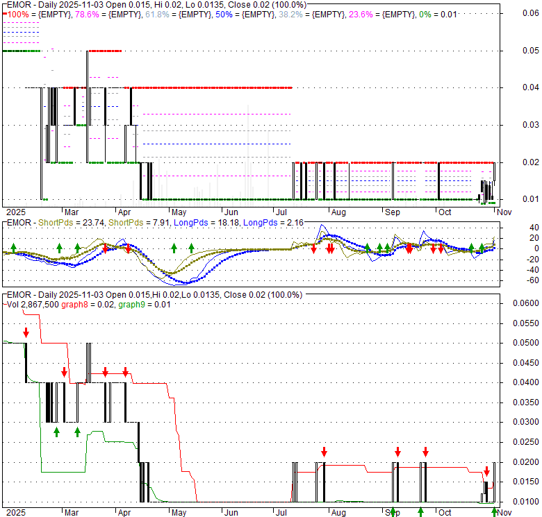 Price has closed above its short-term moving average. Short-term moving average is currently above mid-term; and above long-term moving average. From the relationship between price and moving averages: This stock is BULLISH in short-term; and BULLISH in mid-long term.[ EMOR ] has closed It is unclear right now based on current values. 40.8% wider than normal. The large width of the bands suggest high volatility as compared to its normal range. The bands have been in this wide range for 0 days. This is a sign that the current trend might continue.