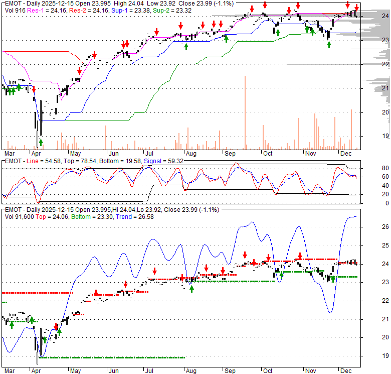 Price has closed below its short-term moving average. Short-term moving average is currently above mid-term; and above long-term moving average. From the relationship between price and moving averages: This stock is NEUTRAL in short-term; and BULLISH in mid-long term.[ EMOT ] has closed above bottom band by 43.0%. Bollinger Bands are 11.9% narrower than normal. The current width of the bands does not suggest anything about the future direction or movement of prices.