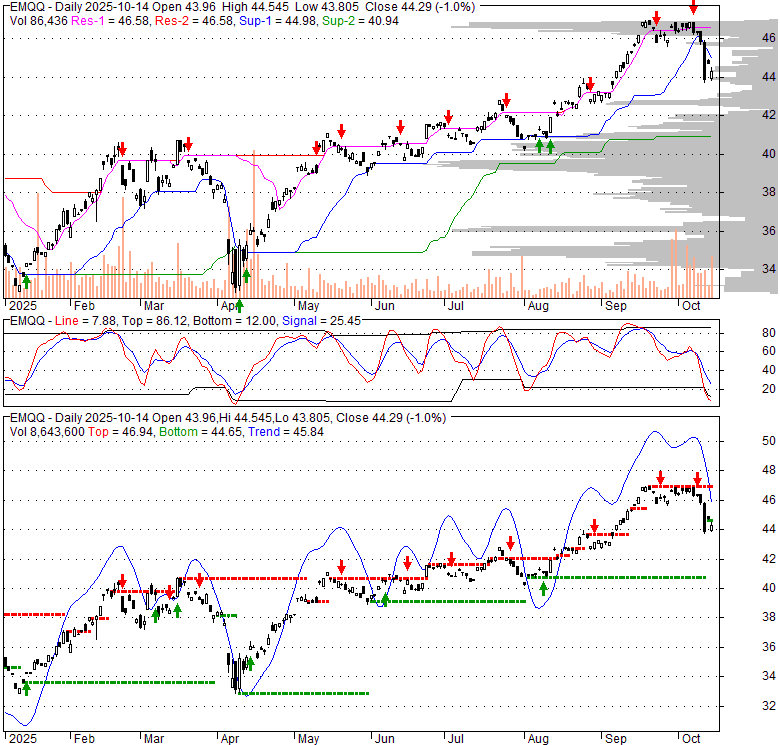 Price has closed below its short-term moving average. Short-term moving average is currently below mid-term; and above long-term moving average. From the relationship between price and moving averages: This stock is BEARISH in short-term; and NEUTRAL in mid-long term.[ EMQQ ] has closed above bottom band by 17.6%. Bollinger Bands are 45.3% wider than normal. The large width of the bands suggest high volatility as compared to its normal range. The bands have been in this wide range for 0 days. This is a sign that the current trend might continue.