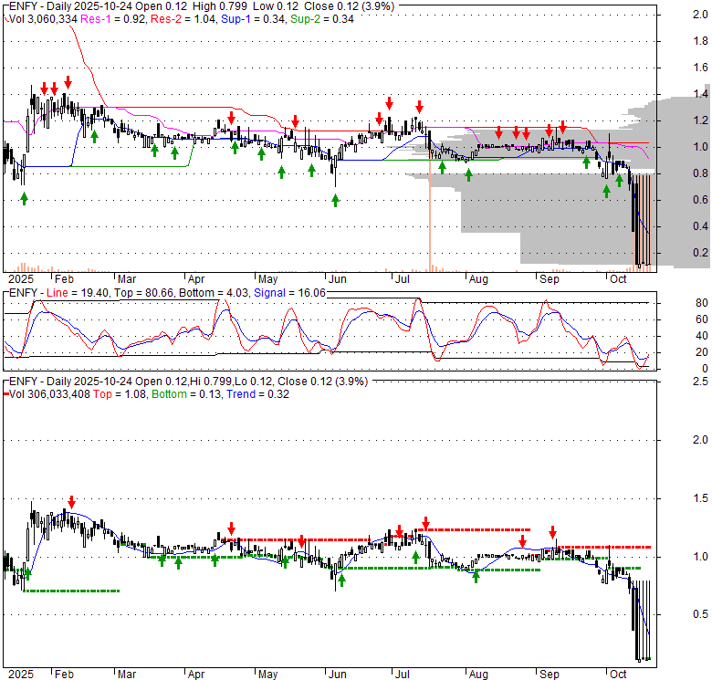 Price has closed below its short-term moving average. Short-term moving average is currently below mid-term; and below long-term moving average. From the relationship between price and moving averages: This stock is BEARISH in short-term; and BEARISH in mid-long term.[ ENFY ] has closed above bottom band by 17.0%. Bollinger Bands are 471.6% wider than normal. The large width of the bands suggest high volatility as compared to its normal range. The bands have been in this wide range for 14 days. This is a sign that the current trend might continue.