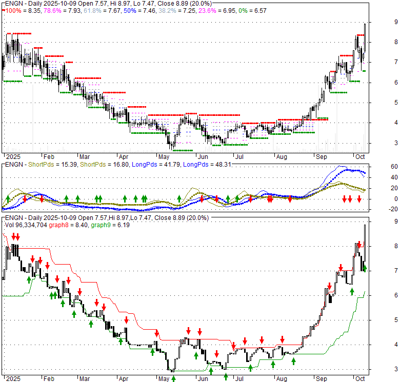 Price has closed above its short-term moving average. Short-term moving average is currently above mid-term; and above long-term moving average. From the relationship between price and moving averages: This stock is BULLISH in short-term; and BULLISH in mid-long term.[ ENGN ] has closed below upper band by 1.6%. Bollinger Bands are 68% wider than normal. The large width of the bands suggest high volatility as compared to its normal range. The bands have been in this wide range for 6 days. This is a sign that the current trend might continue.