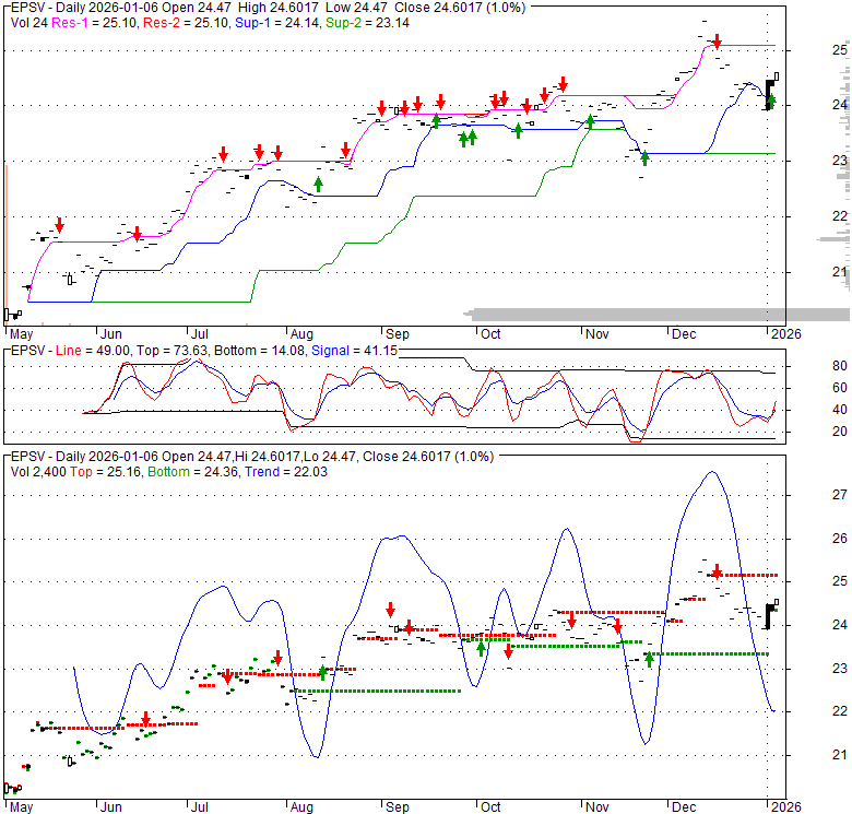 Price has closed above its short-term moving average. Short-term moving average is currently above mid-term; and above long-term moving average. From the relationship between price and moving averages: This stock is BULLISH in short-term; and BULLISH in mid-long term.[ EPSV ] has closed below upper band by 36.2%. Bollinger Bands are 0.2% narrower than normal. The current width of the bands does not suggest anything about the future direction or movement of prices.