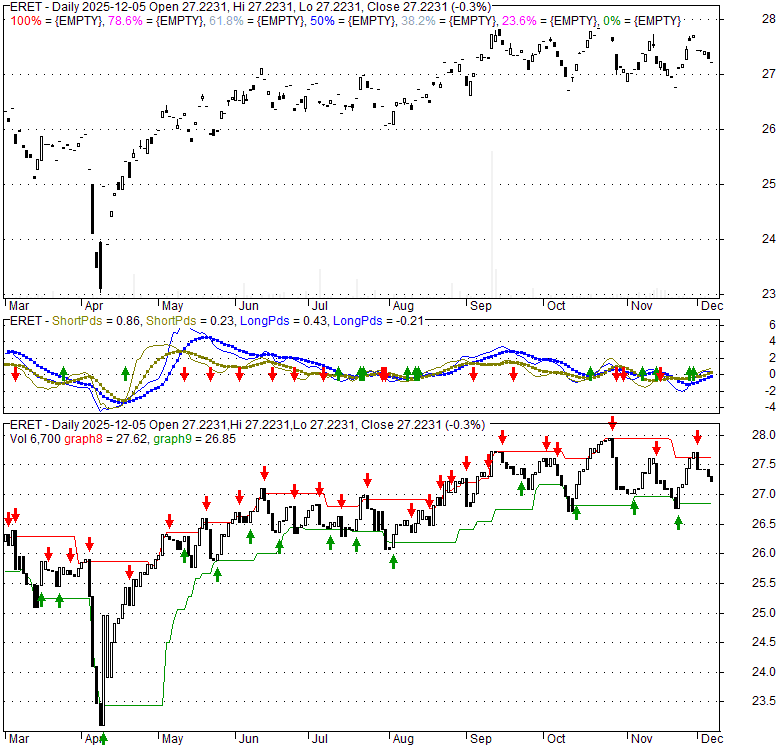 Price has closed below its short-term moving average. Short-term moving average is currently above mid-term; and above long-term moving average. From the relationship between price and moving averages: This stock is NEUTRAL in short-term; and BULLISH in mid-long term.[ ERET ] has closed above bottom band by 45.6%. Bollinger Bands are 1.9% narrower than normal. The current width of the bands does not suggest anything about the future direction or movement of prices.