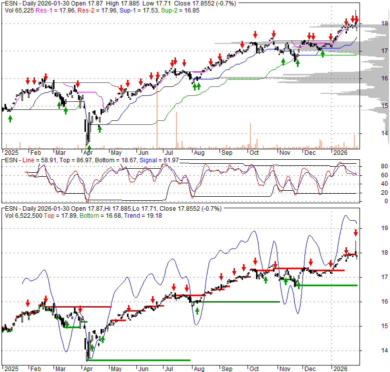 Price has closed below its short-term moving average. Short-term moving average is currently above mid-term; and above long-term moving average. From the relationship between price and moving averages: This stock is NEUTRAL in short-term; and BULLISH in mid-long term.[ ESN ] has closed above bottom band by 47.6%. Bollinger Bands are 40.2% narrower than normal. The narrow width of the bands suggests low volatility as compared to its normal range. The bands have been in this narrow range for 0 bars. This is a sign that the market may be about to initiate a new trend.
