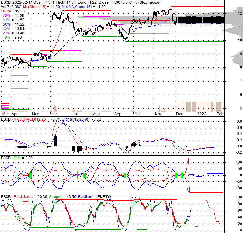 Price has closed below its short-term moving average. Short-term moving average is currently below mid-term; and below long-term moving average. From the relationship between price and moving averages: This stock is NEUTRAL in short-term; and NEUTRAL in mid-long term.[ ESXB ] has closed Bollinger Bands are 100% narrower than normal. The narrow width of the bands suggests low volatility as compared to its normal range. The bands have been in this narrow range for 39 bars. This is a sign that the market may be about to initiate a new trend.