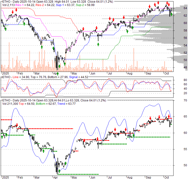 Price has closed above its short-term moving average. Short-term moving average is currently above mid-term; and above long-term moving average. From the relationship between price and moving averages: This stock is BULLISH in short-term; and BULLISH in mid-long term.[ ETHO ] has closed below upper band by 25.7%. Bollinger Bands are 8.4% narrower than normal. The current width of the bands does not suggest anything about the future direction or movement of prices.