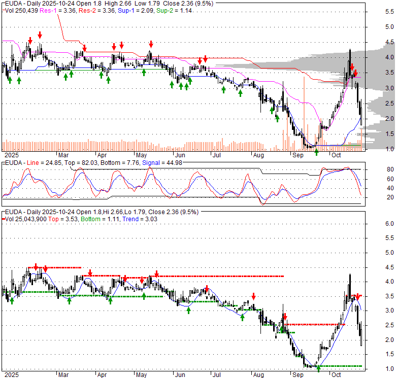 Price has closed below its short-term moving average. Short-term moving average is currently above mid-term; and above long-term moving average. From the relationship between price and moving averages: This stock is NEUTRAL in short-term; and NEUTRAL in mid-long term.[ EUDA ] has closed above bottom band by 32.3%. Bollinger Bands are 83.5% wider than normal. The large width of the bands suggest high volatility as compared to its normal range. The bands have been in this wide range for 17 days. This is a sign that the current trend might continue.