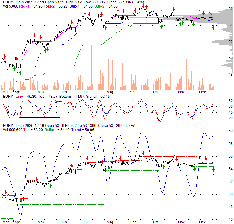 Price has closed below its short-term moving average. Short-term moving average is currently below mid-term; and below long-term moving average. From the relationship between price and moving averages: This stock is BEARISH in short-term; and BEARISH in mid-long term.[ EUHY ] has closed below the lower bollinger band by 42.7%. Although price has broken the lower band and a downside breakout is possible; the most likely direction for [ EUHY ] is to continue within current trading range. It is unclear right now based on current values. 53.5% wider than normal. The large width of the bands suggest high volatility as compared to its normal range. The bands have been in this wide range for 0 days. This is a sign that the current trend might continue.