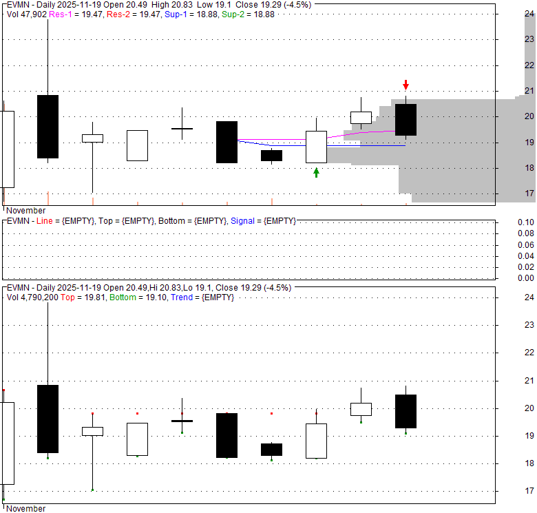 Price has closed above its short-term moving average. Short-term moving average is currently below mid-term; and below long-term moving average. From the relationship between price and moving averages: This stock is NEUTRAL in short-term; and NEUTRAL in mid-long term.[ EVMN ] has closed Bollinger Bands are 0% narrower than normal.