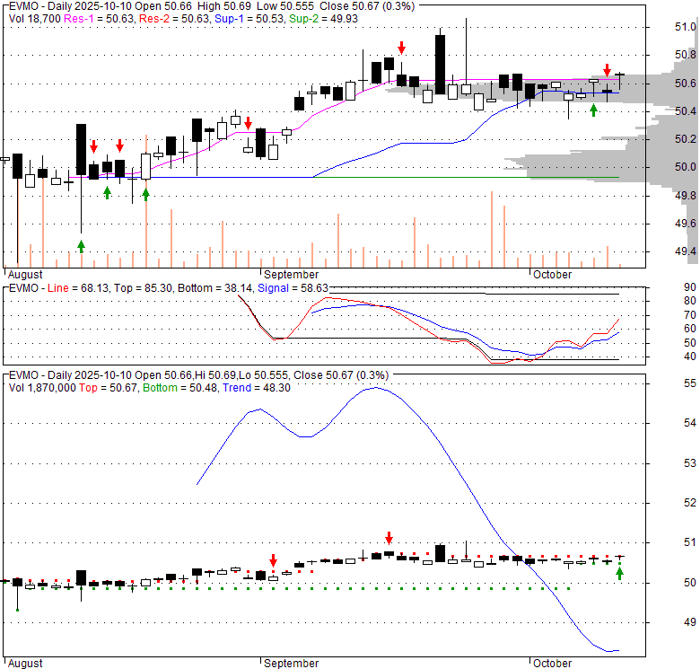 Price has closed above its short-term moving average. Short-term moving average is currently above mid-term; and below long-term moving average. From the relationship between price and moving averages: This stock is BULLISH in short-term; and NEUTRAL in mid-long term.[ EVMO ] has closed Bollinger Bands are 0% narrower than normal.