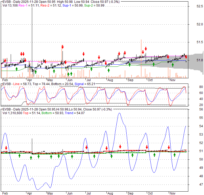 Price has closed below its short-term moving average. Short-term moving average is currently above mid-term; and above long-term moving average. From the relationship between price and moving averages: This stock is NEUTRAL in short-term; and BULLISH in mid-long term.[ EVSB ] has closed above bottom band by 5.9%. Bollinger Bands are 7.9% narrower than normal. The current width of the bands does not suggest anything about the future direction or movement of prices.