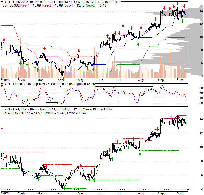 Price has closed below its short-term moving average. Short-term moving average is currently above mid-term; and above long-term moving average. From the relationship between price and moving averages: This stock is NEUTRAL in short-term; and BULLISH in mid-long term.[ EYPT ] has closed above bottom band by 19.4%. Bollinger Bands are 33.3% narrower than normal. The current width of the bands does not suggest anything about the future direction or movement of prices.