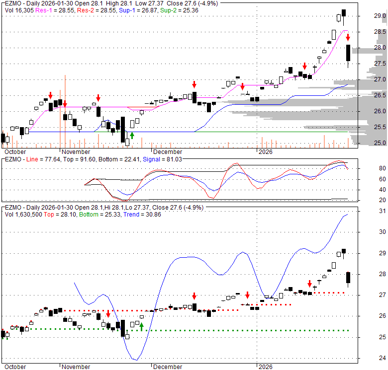 Price has closed below its short-term moving average. Short-term moving average is currently above mid-term; and below long-term moving average. From the relationship between price and moving averages: This stock is NEUTRAL in short-term; and NEUTRAL in mid-long term.[ EZMO ] has closed above bottom band by 46.7%. Bollinger Bands are 0% narrower than normal.