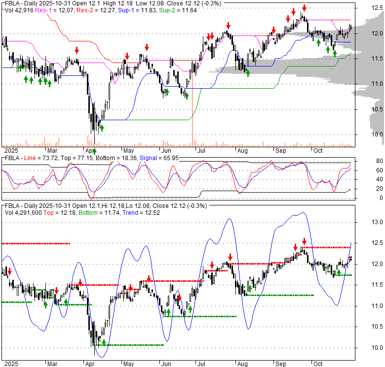 Price has closed above its short-term moving average. Short-term moving average is currently above mid-term; and above long-term moving average. From the relationship between price and moving averages: This stock is BULLISH in short-term; and BULLISH in mid-long term.[ FBLA ] has closed below upper band by 16.7%. Bollinger Bands are 30.2% narrower than normal. The current width of the bands does not suggest anything about the future direction or movement of prices.