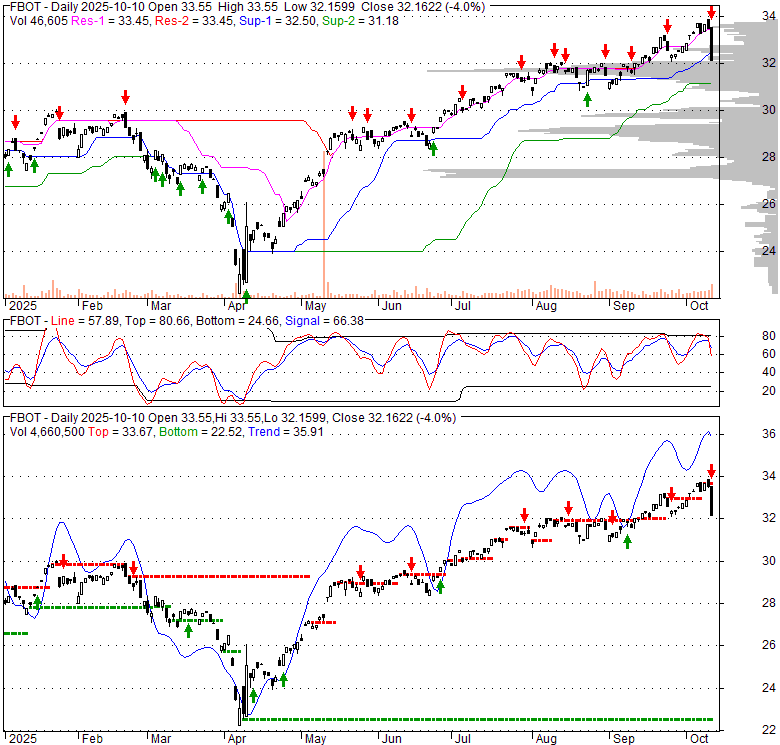 Price has closed below its short-term moving average. Short-term moving average is currently above mid-term; and above long-term moving average. From the relationship between price and moving averages: This stock is NEUTRAL in short-term; and BULLISH in mid-long term.[ FBOT ] has closed above bottom band by 10.0%. Bollinger Bands are 20% wider than normal. The current width of the bands does not suggest anything about the future direction or movement of prices.