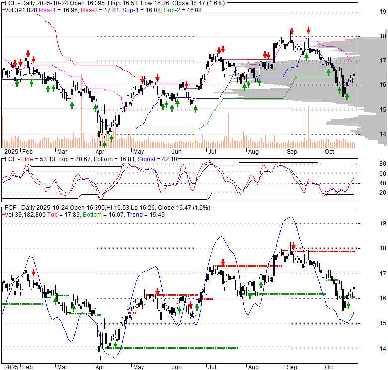 Price has closed above its short-term moving average. Short-term moving average is currently below mid-term; and below long-term moving average. From the relationship between price and moving averages: This stock is NEUTRAL in short-term; and NEUTRAL in mid-long term.[ FCF ] has closed below upper band by 41.1%. Bollinger Bands are 15.5% wider than normal. The current width of the bands does not suggest anything about the future direction or movement of prices.