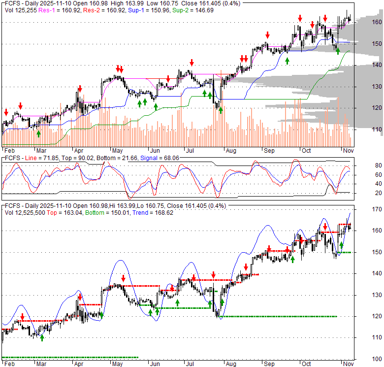 Price has closed above its short-term moving average. Short-term moving average is currently above mid-term; and above long-term moving average. From the relationship between price and moving averages: This stock is BULLISH in short-term; and BULLISH in mid-long term.[ FCFS ] has closed below upper band by 20.0%. Bollinger Bands are 39.6% wider than normal. The current width of the bands does not suggest anything about the future direction or movement of prices.