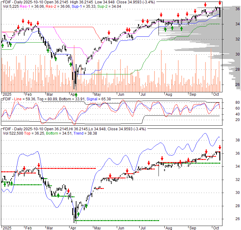 Price has closed below its short-term moving average. Short-term moving average is currently above mid-term; and above long-term moving average. From the relationship between price and moving averages: This stock is NEUTRAL in short-term; and BULLISH in mid-long term.[ FDIF ] has closed above bottom band by 10.1%. Bollinger Bands are 7.6% wider than normal. The current width of the bands does not suggest anything about the future direction or movement of prices.
