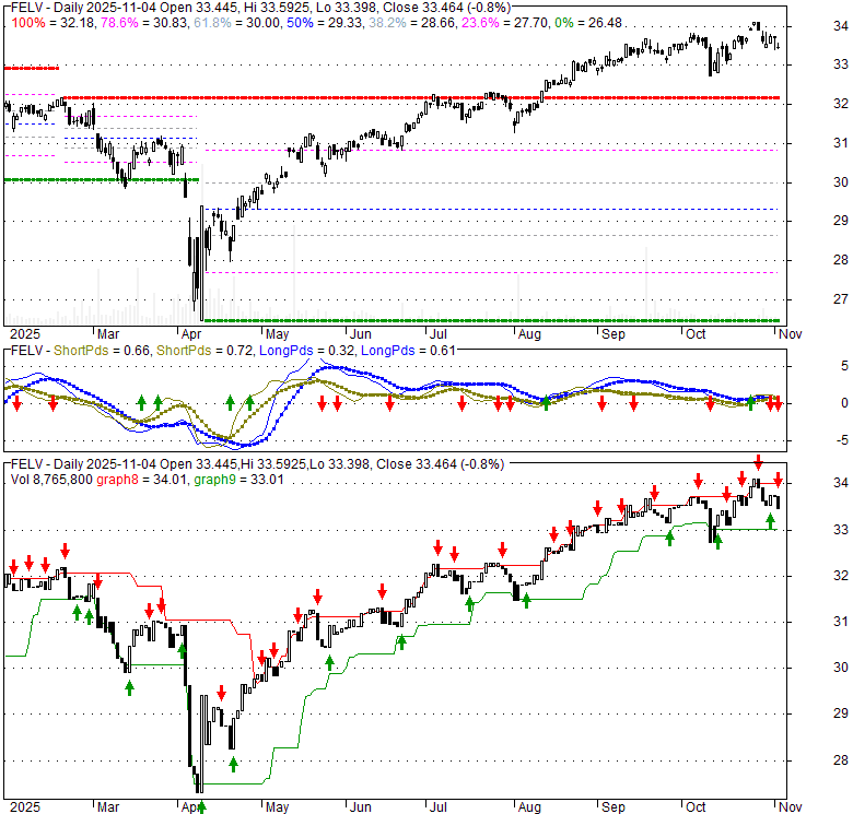 Price has closed below its short-term moving average. Short-term moving average is currently above mid-term; and above long-term moving average. From the relationship between price and moving averages: This stock is NEUTRAL in short-term; and BULLISH in mid-long term.[ FELV ] has closed above bottom band by 33.2%. Bollinger Bands are 1.5% wider than normal. The current width of the bands does not suggest anything about the future direction or movement of prices.