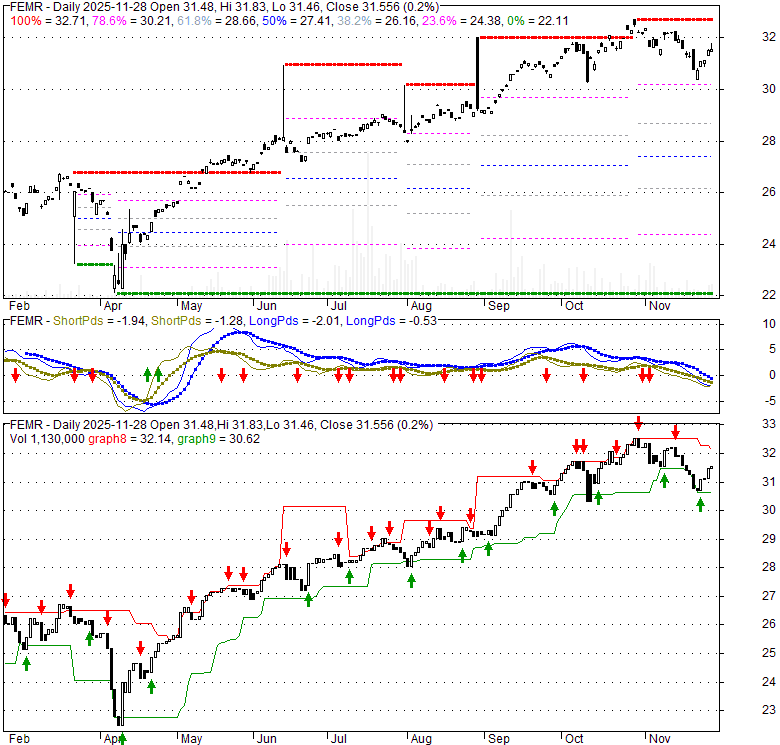 Price has closed above its short-term moving average. Short-term moving average is currently below mid-term; and above long-term moving average. From the relationship between price and moving averages: This stock is NEUTRAL in short-term; and NEUTRAL in mid-long term.[ FEMR ] has closed below upper band by 48.5%. Bollinger Bands are 35.5% wider than normal. The current width of the bands does not suggest anything about the future direction or movement of prices.